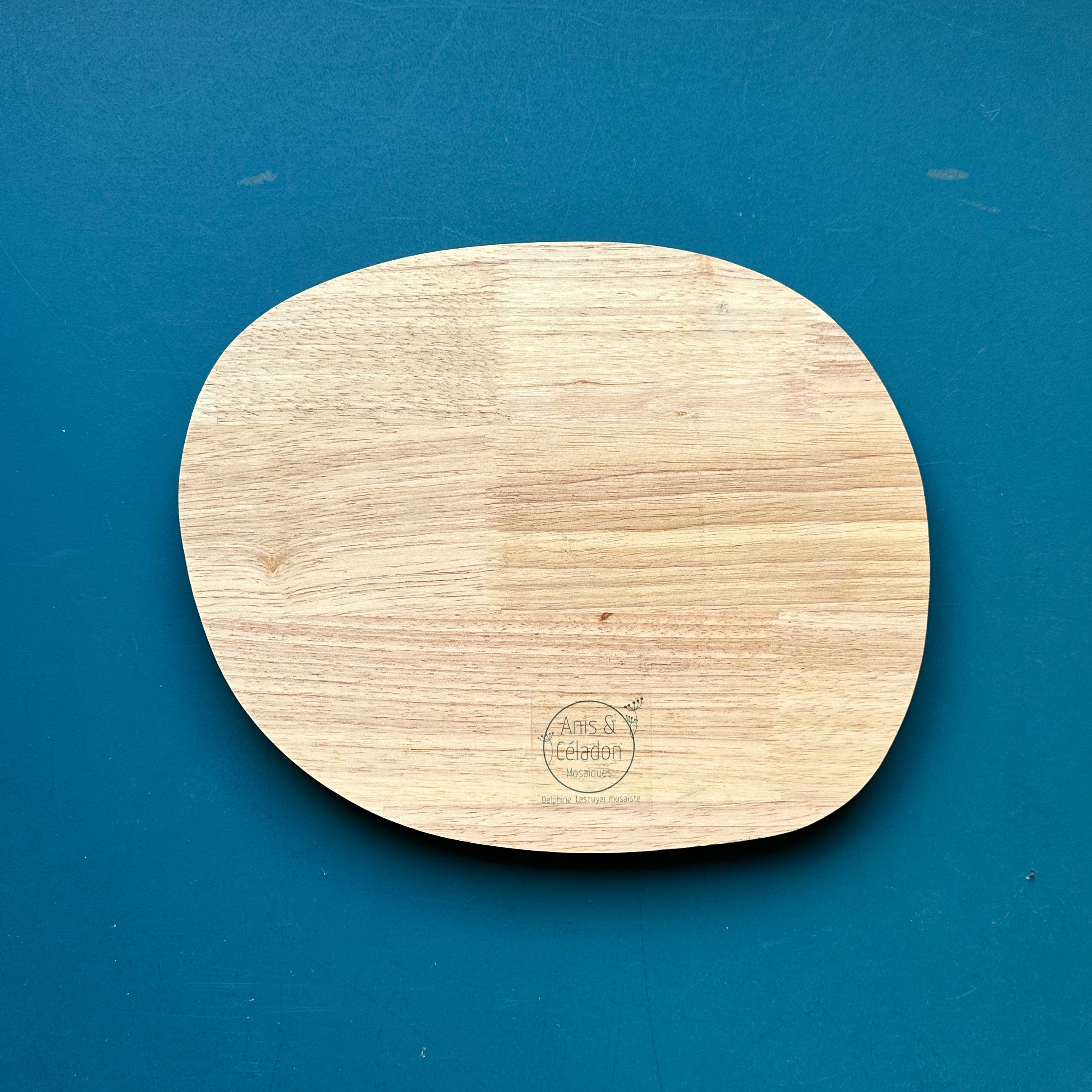 Matières utilisées: plateau épais en bois d'hévéa inscrusté d'une mosaïque de carrelage de faïence émaillée taillé à la main, avec galets japonais en grès émaillé craquelé. Joint de ciment anthracite vieilli.