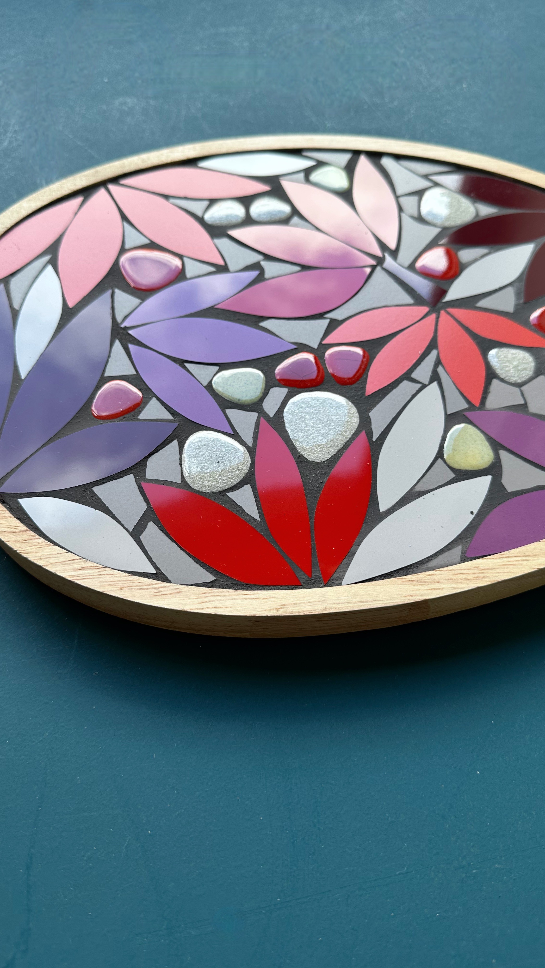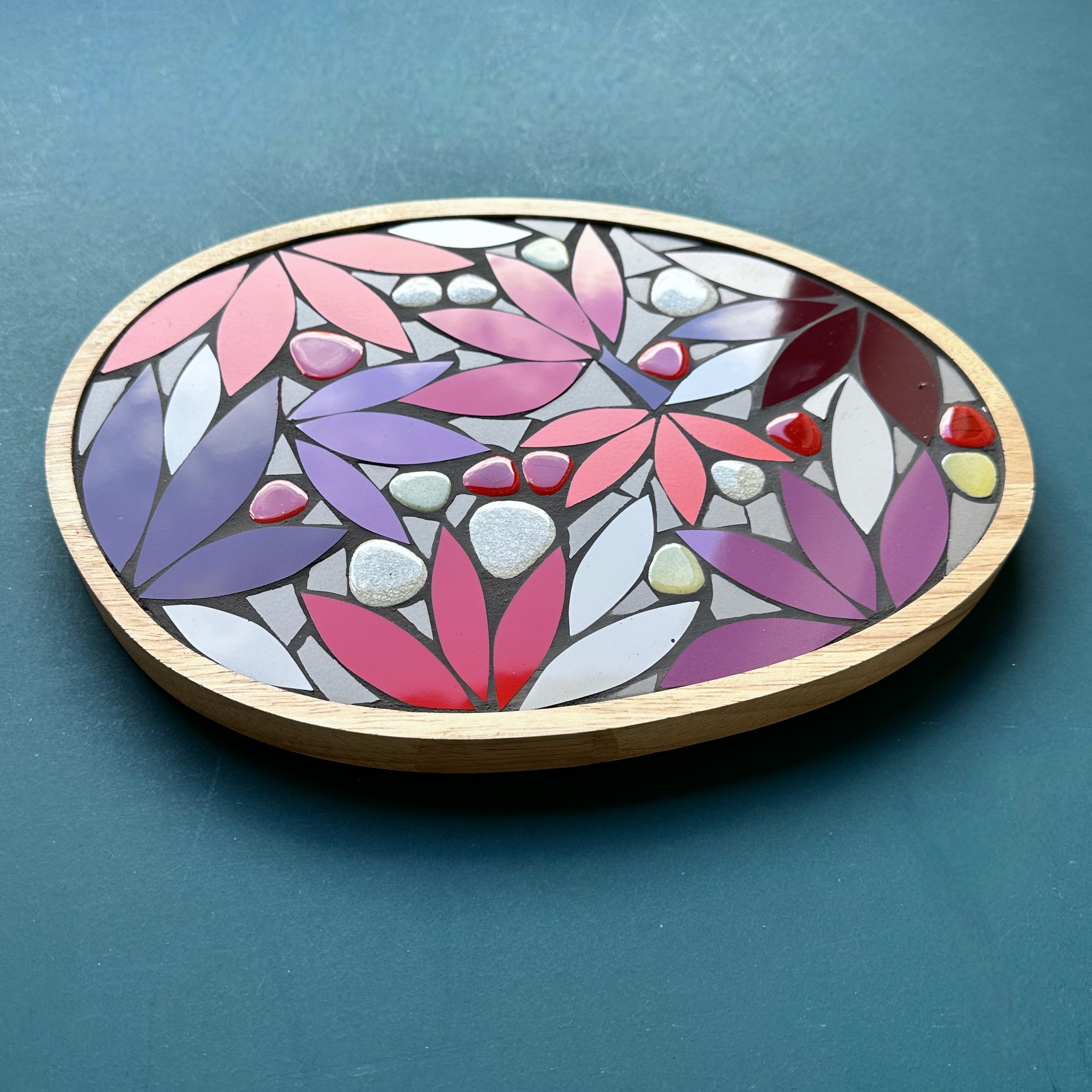 Le décor mosaïque est inséré dans un plateau en bois d'hévéa, d'une épaisseur de 2 cm. Entre le plateau et le centre de table, cet objet décoratif résistant à la chaleur et aux taches peut être disposé sur une surface plane, mais il peut aussi être imaginé comme un tableau mural. Il suffit de demander la pose d'une attache lors de votre commande. Son poids est de 1,1 kg.