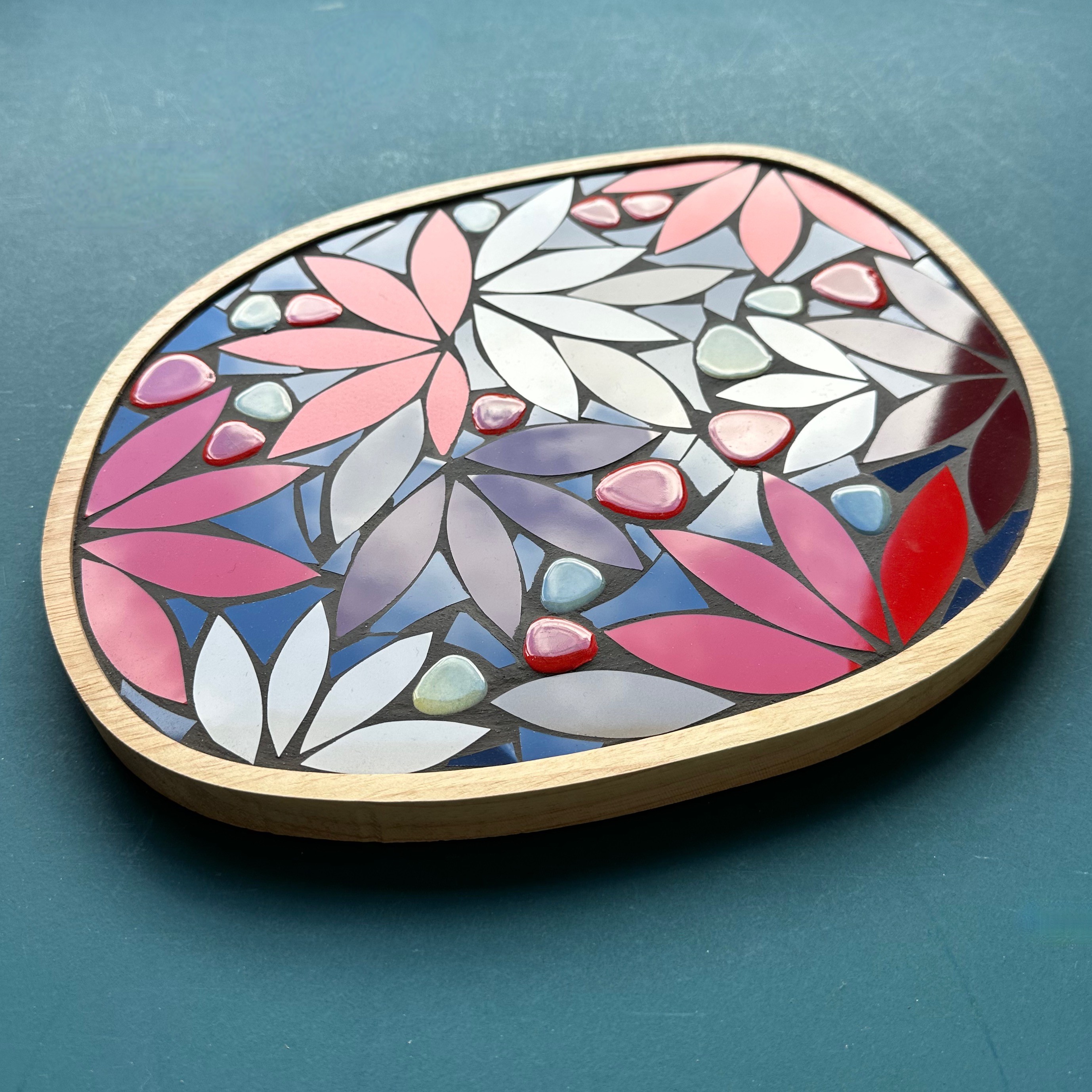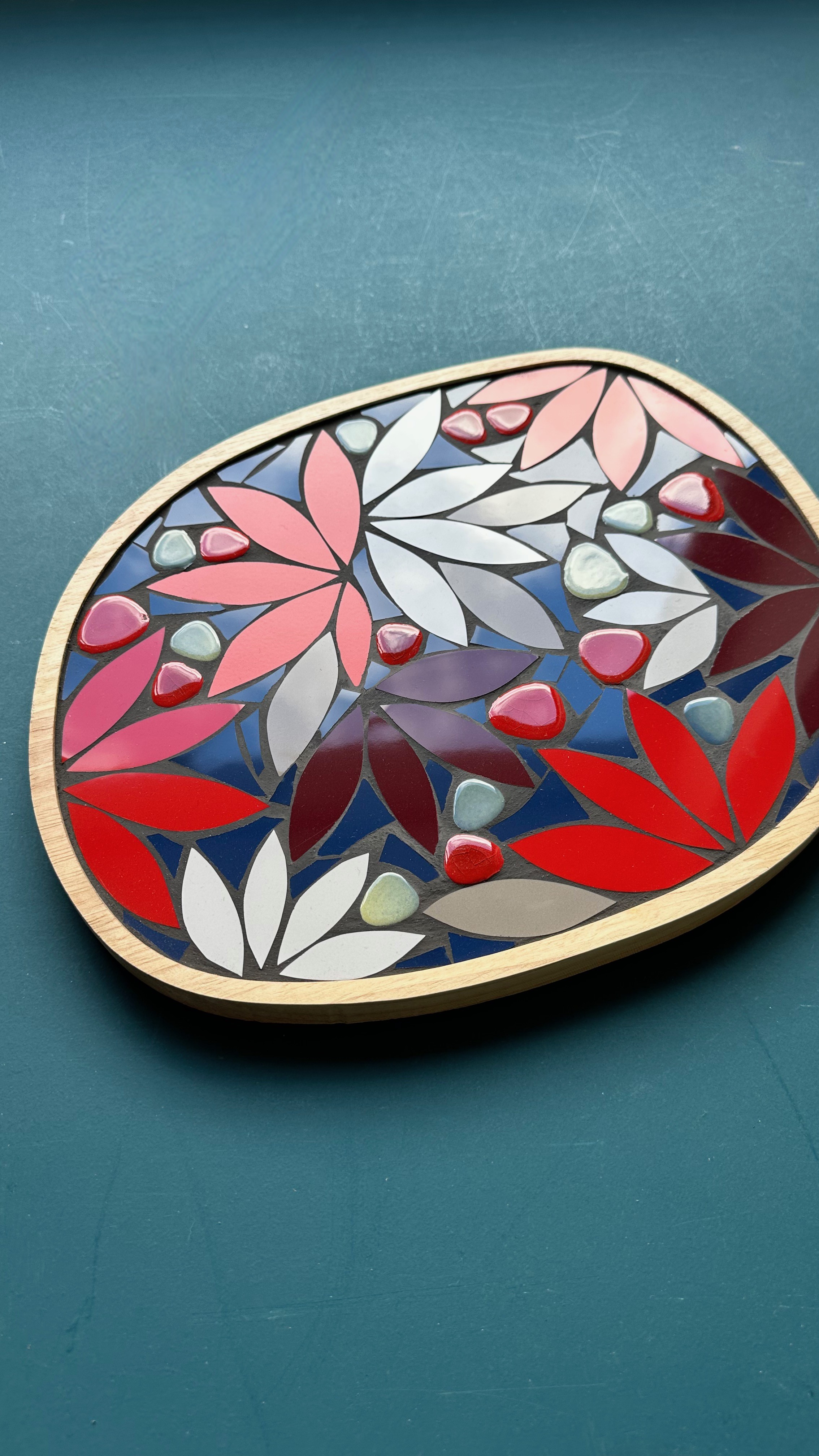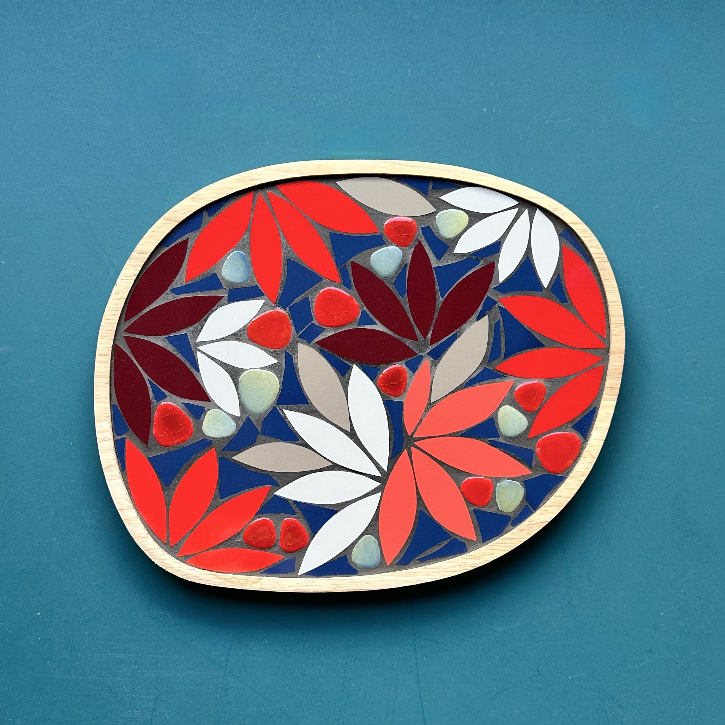 Le décor mosaïque est inséré dans un plateau en bois d'hévéa, d'une épaisseur de 2 cm. Entre le plateau et le centre de table, cet objet décoratif résistant à la chaleur et aux taches peut être disposé sur une surface plane, mais il peut aussi être imaginé comme un tableau mural. Il suffit de demander la pose d'une attache lors de votre commande. Son poids est de 1,2 kg.