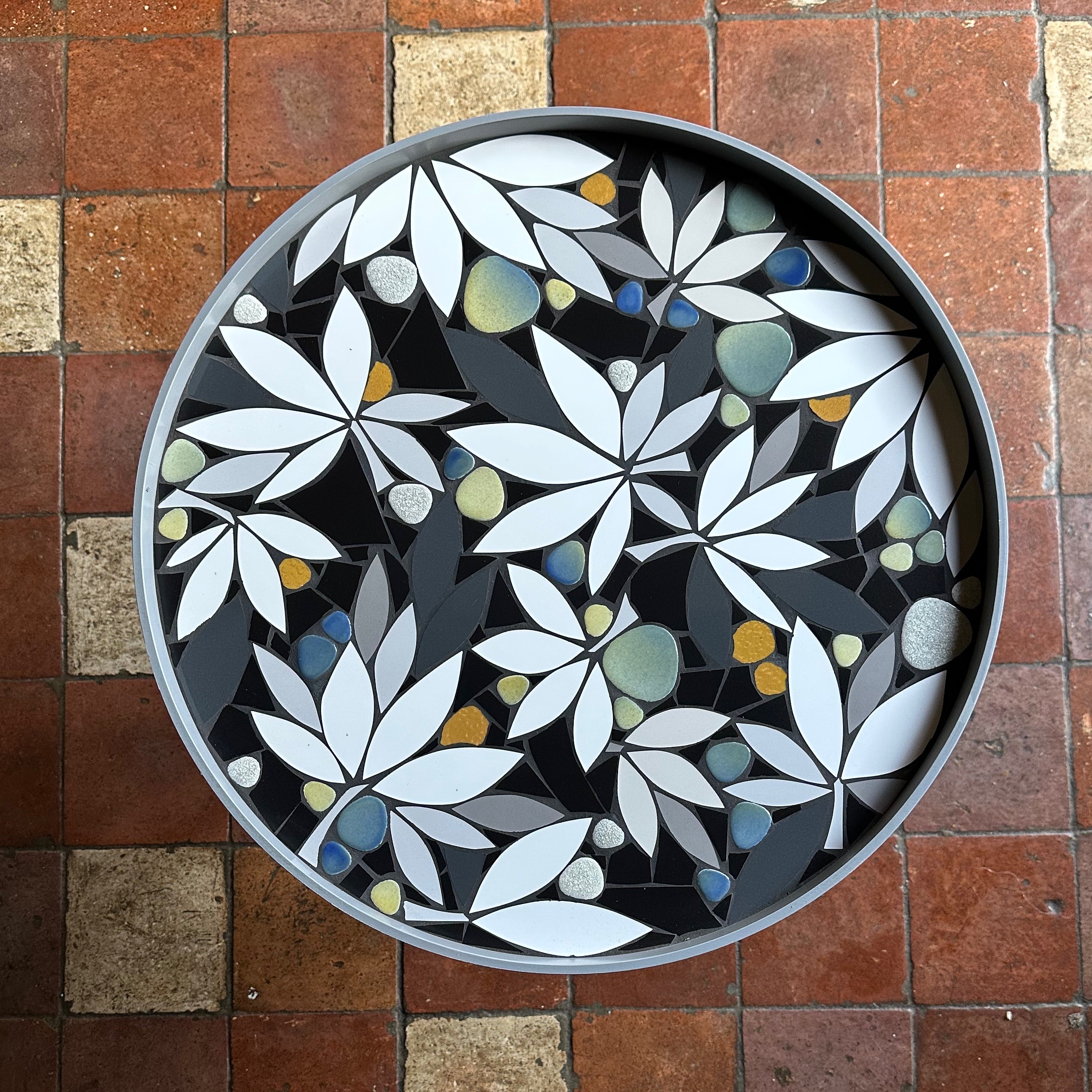 Inspirée du jardin mais aussi des motifs textiles, les fleurs stylisées du décor "Magnolia" sont une signature de l'atelier Anis et Céladon. Les découpes parfaites, la rondeur et le jeu des reflets sont longuement étudiées et équilibrées pour obtenir un rendu le plus élégant possible. Le décor en mosaïque de faïence est réalisé à la main, il offre une belle profondeur et des reflets surprenants qui jouent avec la lumière.